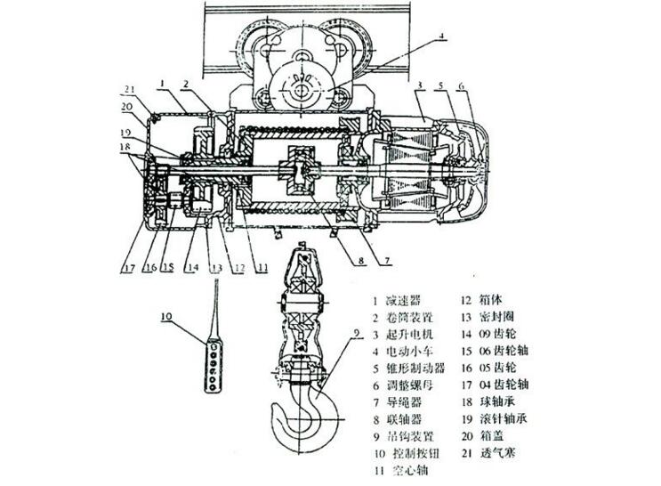 CD1型鋼絲繩電動葫蘆組成的部分大致可分為:減速器、控制箱、鋼絲繩、錐形電動機、按鈕開關。