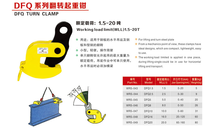 DFQ型翻轉(zhuǎn)吊鉗適用于鋼板水平吊裝、豎直吊裝和型鋼的翻轉(zhuǎn),此類(lèi)起重鉗采用首鋼低碳優(yōu)質(zhì)合金鋼制造,強(qiáng)韌耐久,易操作。更適于h鋼翻轉(zhuǎn)(由H狀—I狀,I狀—H狀),載荷范圍:0-5噸。DFQ型翻轉(zhuǎn)鋼板吊鉗以單只試驗(yàn)為額定載荷,吊裝作業(yè)時(shí)單只使用,水平吊裝時(shí),必須加平衡梁,在吊裝過(guò)程中不得碰撞被吊物,嚴(yán)禁超載使用。本產(chǎn)品嚴(yán)格按國(guó)家3包執(zhí)行,產(chǎn)品質(zhì)量由中國(guó)人民保險(xiǎn)公司(PICC)承保,請(qǐng)放心使用。