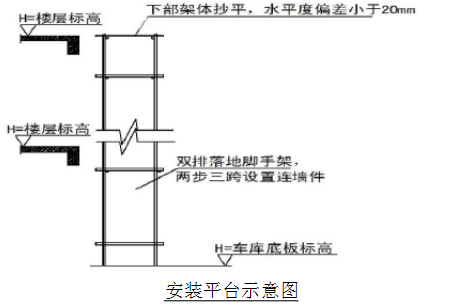 爬架安裝:爬架搭設前,采用落地架作為安裝平臺,詳見下圖,來承受安裝時的豎向荷載,平臺寬度1.5m。承受荷載大于3kn/m2,其水平度偏差應在20mm之內。