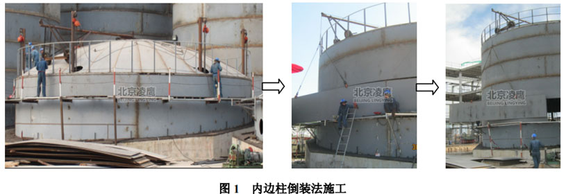 電動葫蘆提升儲罐利用均布在儲罐內側帶有電動葫蘆的內邊住提升帶脹緊固定脹圈的壁板,使組裝好的拱頂和第一圈壁板隨脹圈上升到適當的高度,利用卷揚機及吊臂吊起第二圈壁板進行組裝,然后將脹圈松開,降至第二圈壁板下部脹緊、固定,再利用內邊柱和電動葫蘆提升,如此往復直至全部壁板組裝完成。內邊住倒裝法施工如圖1所示: