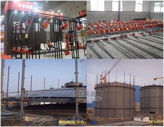 與氣頂升法相比,具有安全可靠的特點。電動葫蘆的自鎖性避免了因臨時停電所造成的危險。同時,由于在橫縫對口時可以從容進行調整,有利于確保罐體幾何尺寸。
