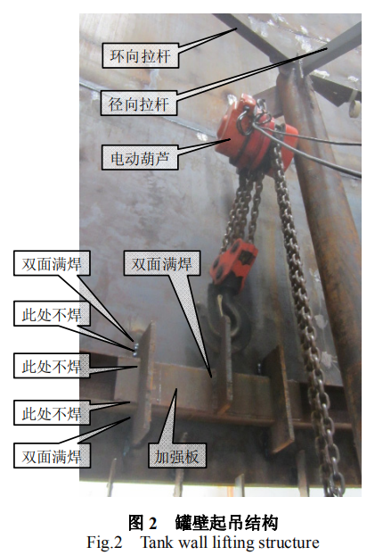 4、組裝第一層(由上至下)壁板-組裝拱頂并開設內邊柱天窗-組裝6根內邊柱及其電動葫蘆提升裝置-通過內外柱上的電動葫蘆往上拉升,帶動儲罐的提升,完成提升罐壁對下一層板的組對,此時拱頂已上升內邊柱外面,可再增加6根內邊柱及電動葫蘆提升裝置-重復提升過程,直至完成全部壁板組對、焊接。
