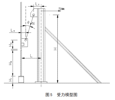 ③電動葫蘆最大受力總和 N=μG/cosθ式中:μ 為電動葫蘆的安全系數 1.5;θ 為電動葫蘆與壁板的夾角,θ 越大 N 越大, 即電動葫蘆受力隨著提升高度的增加而增大,按最大提升高度計算。θ=arctan(L-L1-L2)/(H-H1-H2-H3);L 為立柱中心距壁板內側距離 600mm;L1 為立柱中心距上吊耳中心距離 180mm;L2 為壁板內側距下吊耳中心距離 220mm;H 為立柱高度4000mm;H1 為臨時座墊高度 300mm;H2 為最大壁板高度(亦是最大提升高度)2200mm;H3 為下吊耳高度 400mm經過計算θ=arctan (L-L1-L2)/(H-H1-H2-H3)=arctan