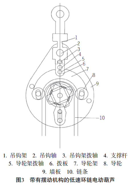 擺動機構的結構:帶有擺動機構的單鏈條葫蘆,可以有效解決葫蘆體受力不平衡、扭鏈、卡鏈、脫鏈、結構不緊湊、運輸安裝不方便等弊端,結構如圖3所示。