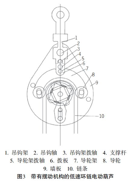 發布日期:2023-08-10 10:51:53 訪問量:2979帶有擺動機構的單鏈條葫蘆,可以有效解決葫蘆體受力不平衡、扭鏈、卡鏈、脫鏈、結構不緊湊、運輸安裝不方便等弊端,結構如圖3所示。