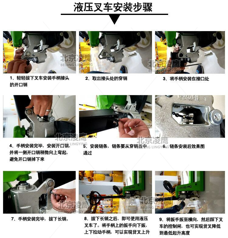 輕輕拔下叉車安裝手柄接頭的開口銷→取出接頭處的穿銷→將手柄安裝在接口處→手柄安裝完畢,安裝開口銷,并將一側開口銷稍微向上彎起,避免開口銷掉下來→安裝鏈條,鏈條要從穿銷當中通過→鏈條安裝后效果圖→手柄安裝完畢,拔下長銷→拔下長銷后,即可使用液壓叉車了。將手柄上的扳手上的扳手向下扳,上下拉動手柄,可以實現貨叉上升→將扳手扳至橫向,然后踩下叉車的控制閘,也可實現貨叉降低到最低起升高度。