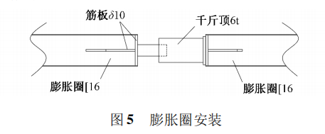 膨脹圈采用16滾弧制成,根據(jù)罐體周長(zhǎng)分若干節(jié)制作,本工程分為4等分,膨脹圈安裝時(shí),在膨脹圈4等分位置處用4個(gè)16t千斤頂將膨脹圈頂緊,使其緊貼在罐壁上,通過(guò)龍門卡具將膨脹圈與罐壁固定成一體,龍門卡具沿著膨脹圈每隔1m設(shè)置一個(gè),膨脹圈用千斤頂頂緊的4個(gè)位置應(yīng)避開(kāi)倒裝立柱。膨脹圈制作成型后的曲率應(yīng)和罐內(nèi)壁的曲率一致,膨脹圈安裝如圖5所示。