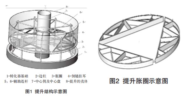 提升脹圈采用槽鋼卷制而成(見圖2)。脹圈外殼為內徑相同的圓,然后等分成三段,中間去掉部分放置螺旋千斤頂,千斤頂用于調節脹緊。脹圈外側表面貼焊薄不銹鋼板,避免碳鋼直接與不銹鋼殼體接觸。提升前調節千斤頂脹圈脹緊,同時,在轉化器殼體脹圈上部轉化器殼體上焊接不銹鋼耳板,起掛耳作用,確保提升受力滿足要求。提升到合適高度后,安裝殼體弧形板下一環帶,并于已提升的轉化器帶殼體焊接后,松開千斤頂,落下脹圈提升機構。重復直至安裝完成。